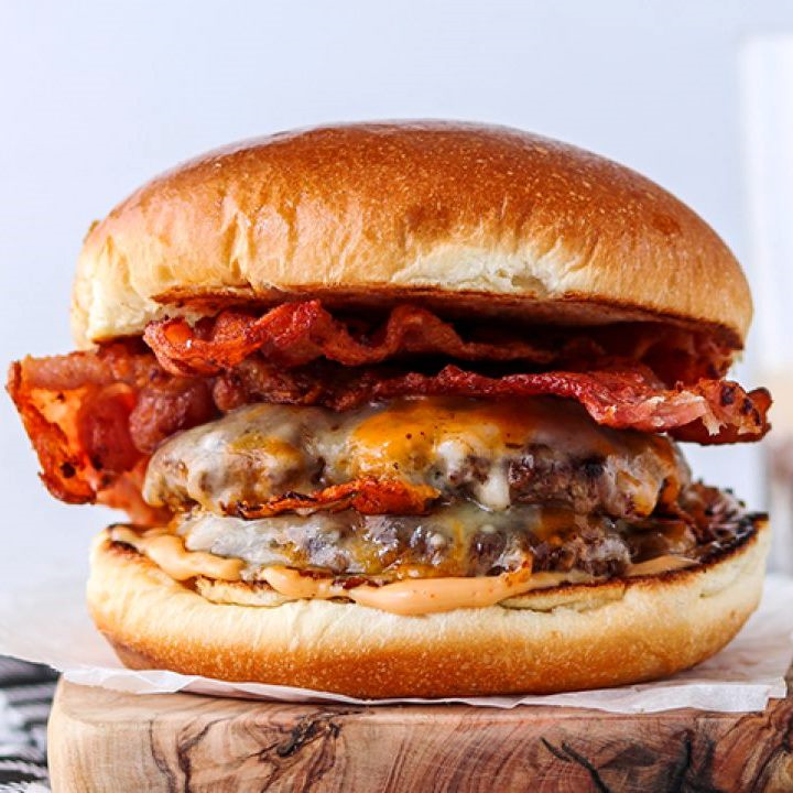 American Cheese, Crispy Bacon, Ketchup, Mustard, Pickles, Lettuce, Tomatoes.